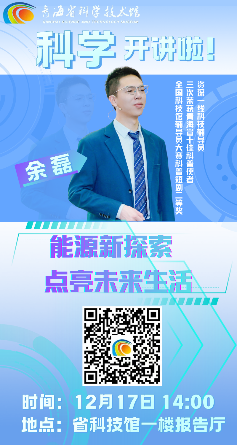 本次主讲人余磊老师,不仅两度获评“青海省十佳科普使者”,更在全国科技馆辅导员大赛中凭借科普短剧斩获二等奖。专业又生动的讲解,将带你读懂新能源的无限可能!