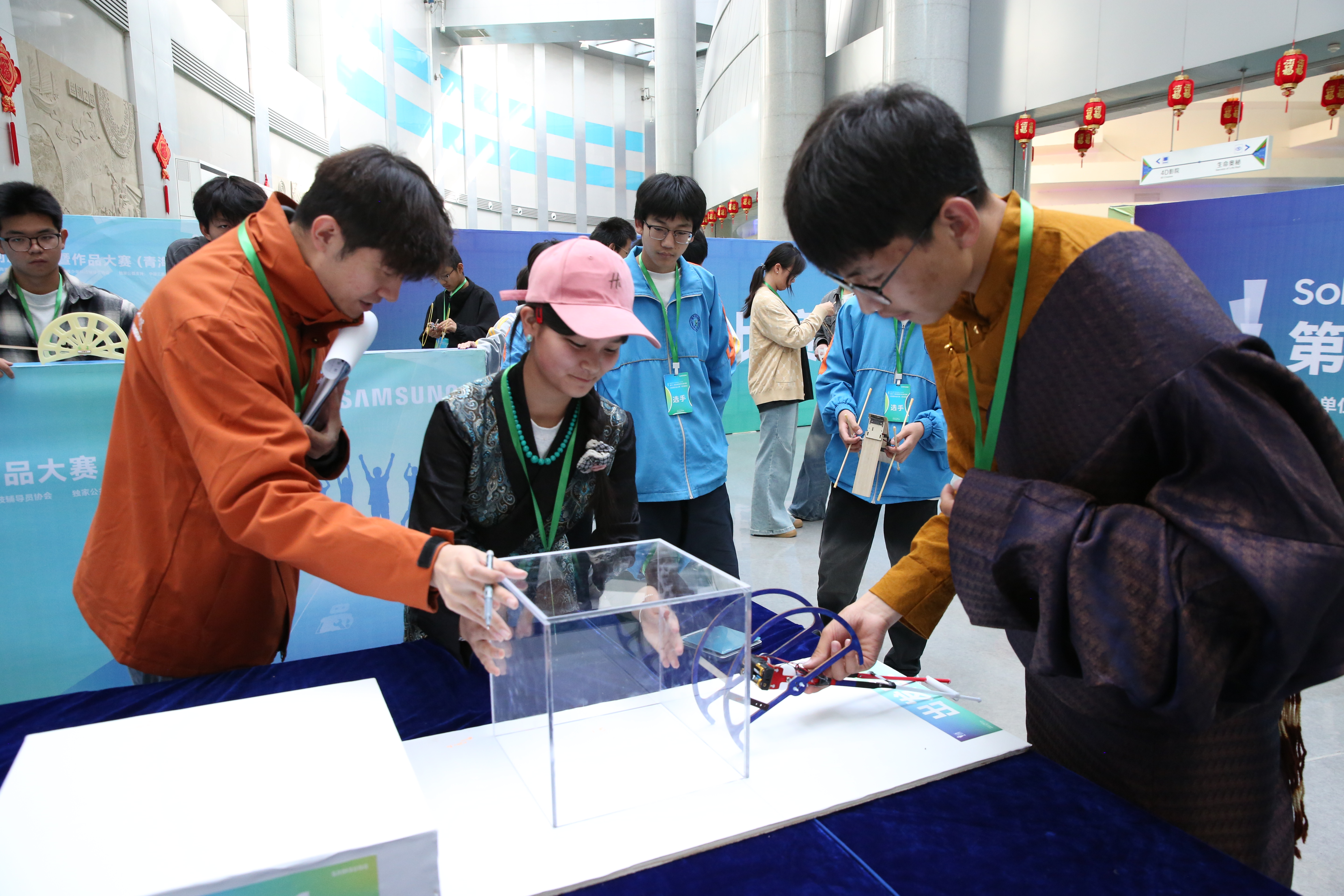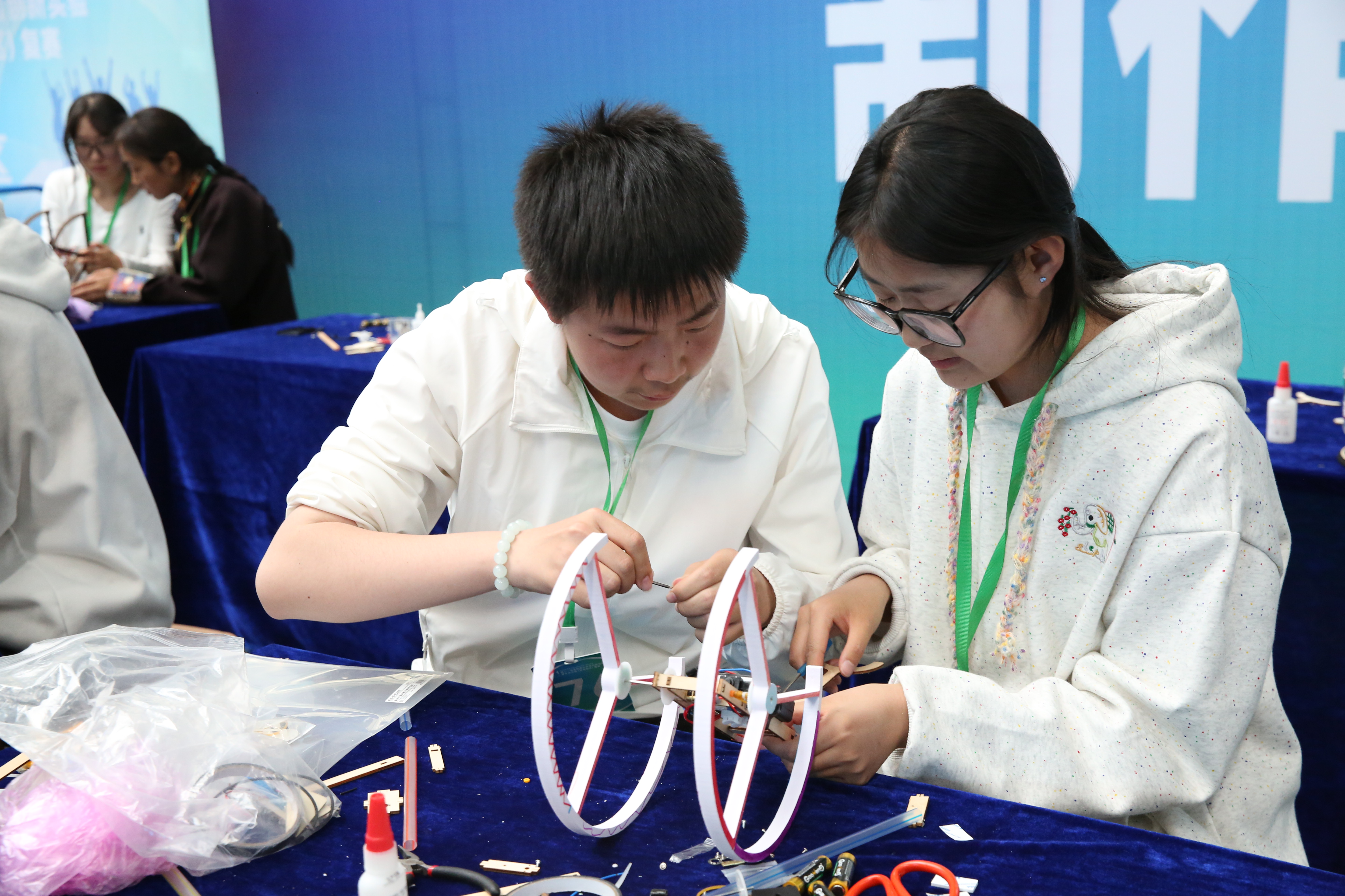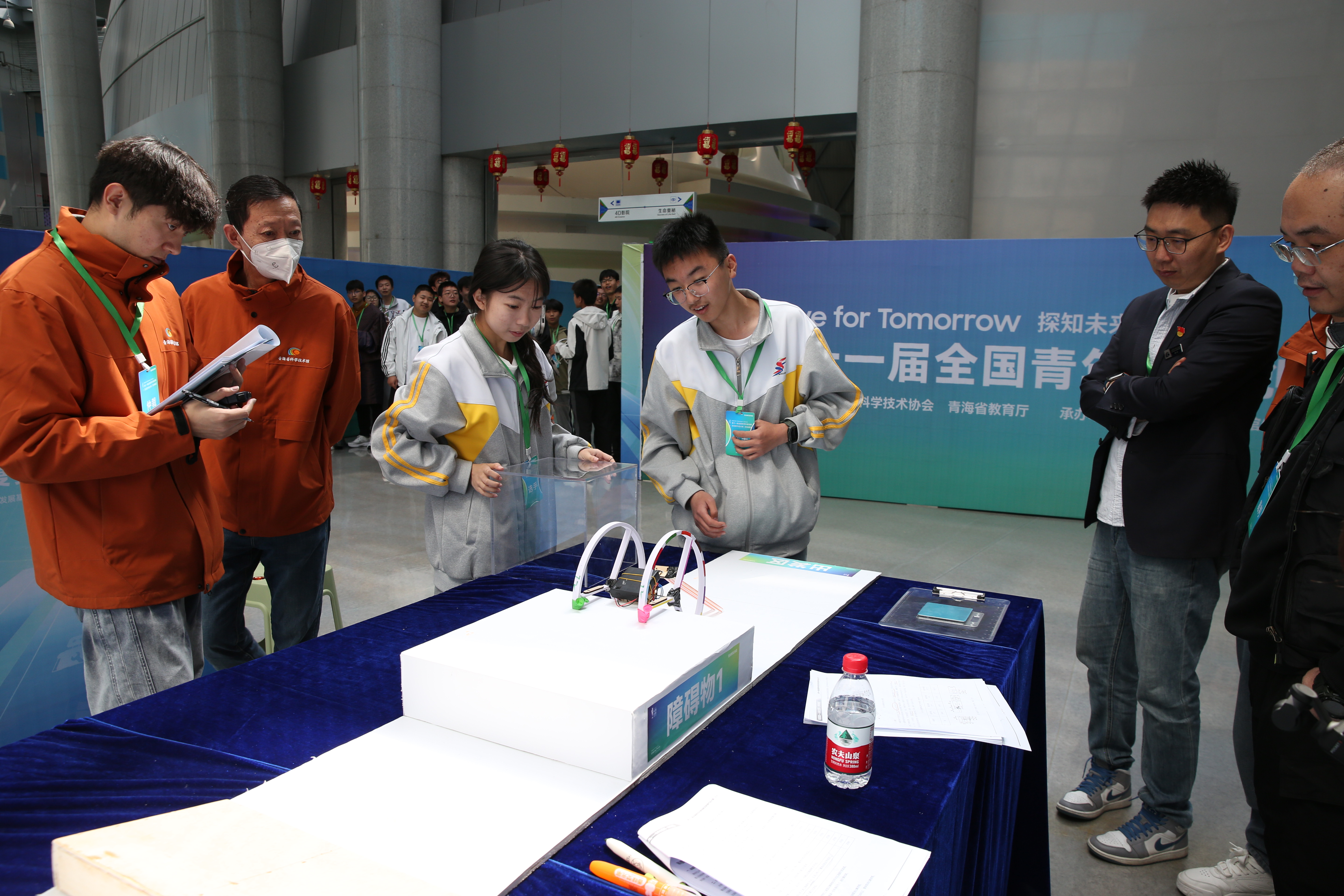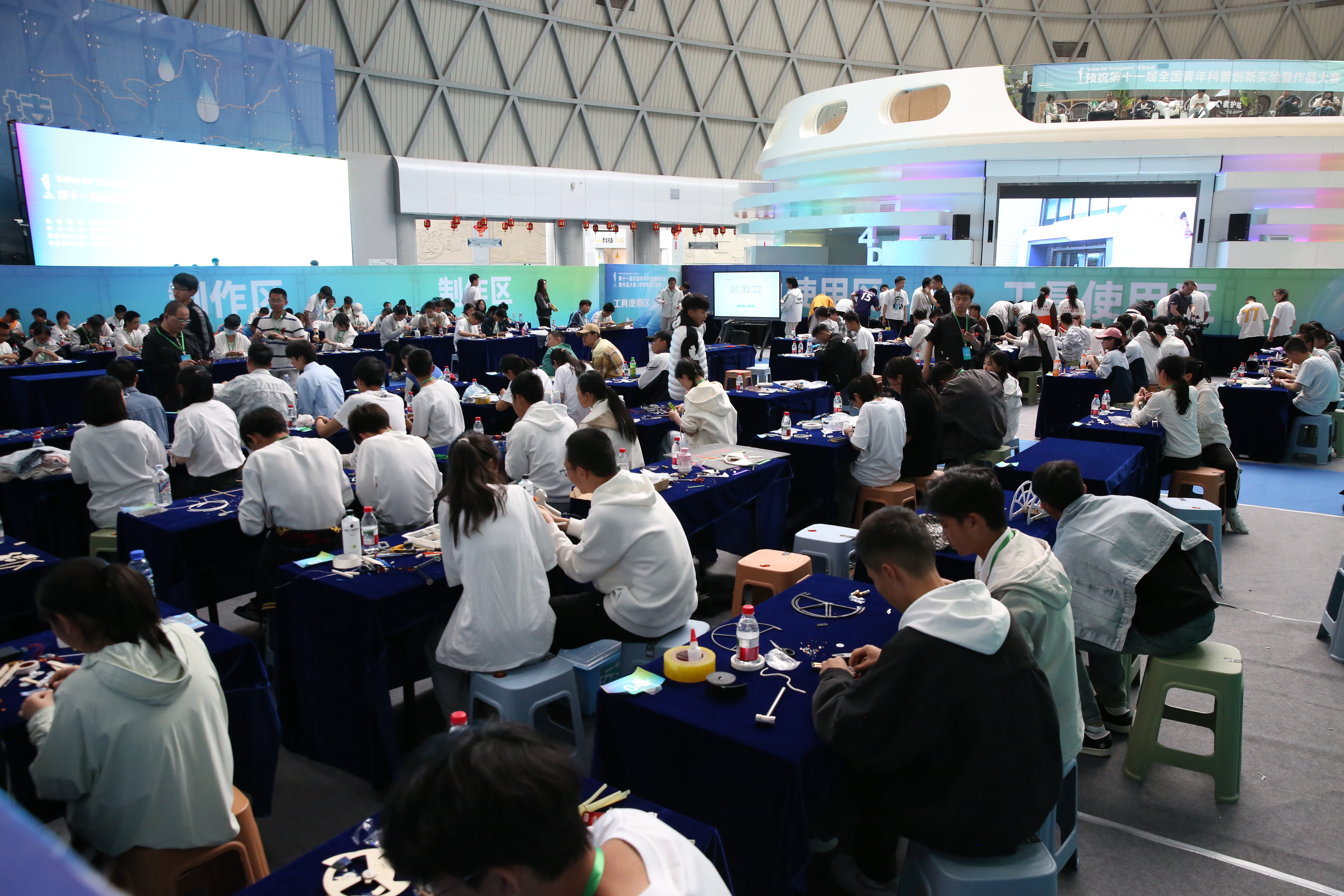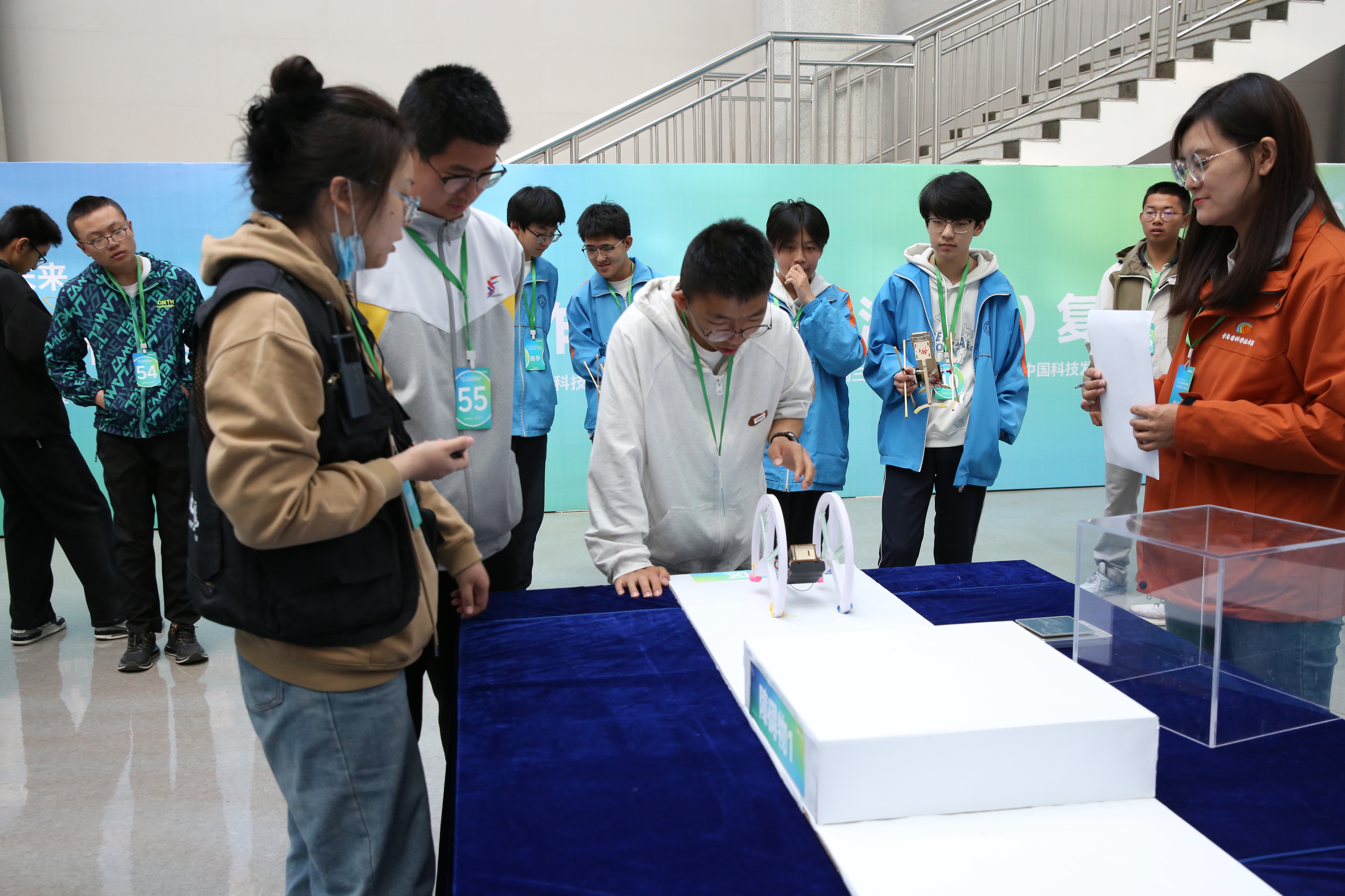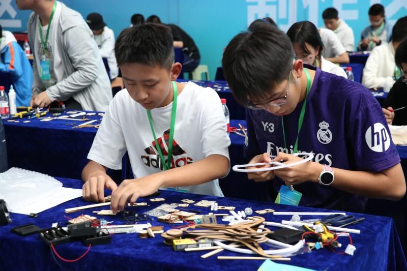 创意作品项目赛道中,“人机协作”(大学组)、“科技改变生活”(中学组)两个项目按现场演示、作品展示和问辩方式三个环节依次进行,选手们从身边问题出发,提出解决方案,设计系统模型进行作品创作,展现出我省青年学生优秀的创新创造能力和激扬的青春风采。科普实验项目赛道分现场制作和现场评审两环节,其中,“未来太空车”项目是以太空探索为背景,利用指定动力系统,自选材料制作装置完成指定任务的创意实验设计,现场参赛队伍充分发挥创造力,共同制作“太空车”,体现出了良好的团队协作精神。