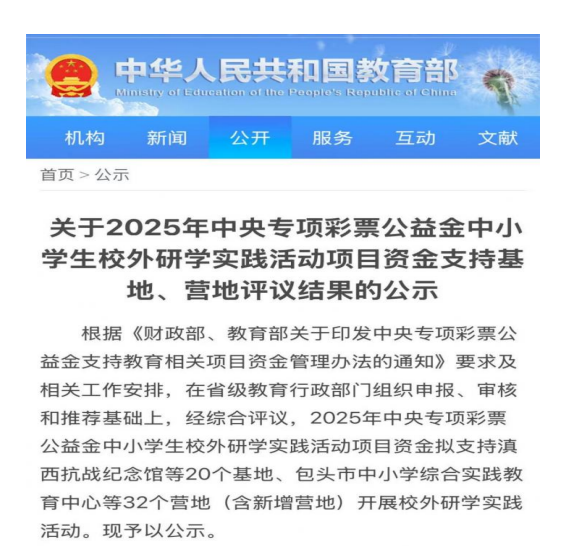 此次评选严格遵循《财政部、教育部关于印发中央专项彩票公益金支持教育相关项目资金管理办法的通知》要求,历经省级教育行政部门组织申报、审核、推荐及国家层面综合评议等多环节流程。最终,全国共有20个基地、32个营地(含新增营地)入选2025年中央专项彩票公益金中小学生校外研学实践活动项目资金支持名单。