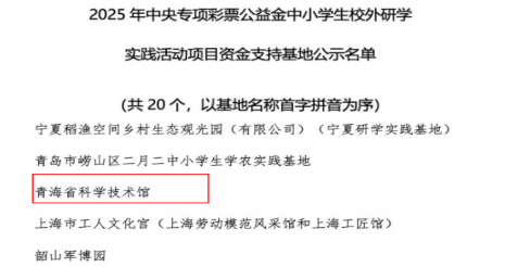 近日,青海省科学技术馆凭借在中小学生科学教育与校外研学领域的长期深耕与突出成效,经中华人民共和国教育部、中华人民共和国财政部综合评议,成功获评“全国中小学生校外研学实践教育基地”,并顺利获得“2025年中央专项彩票公益金中小学生校外研学实践活动项目”资助。